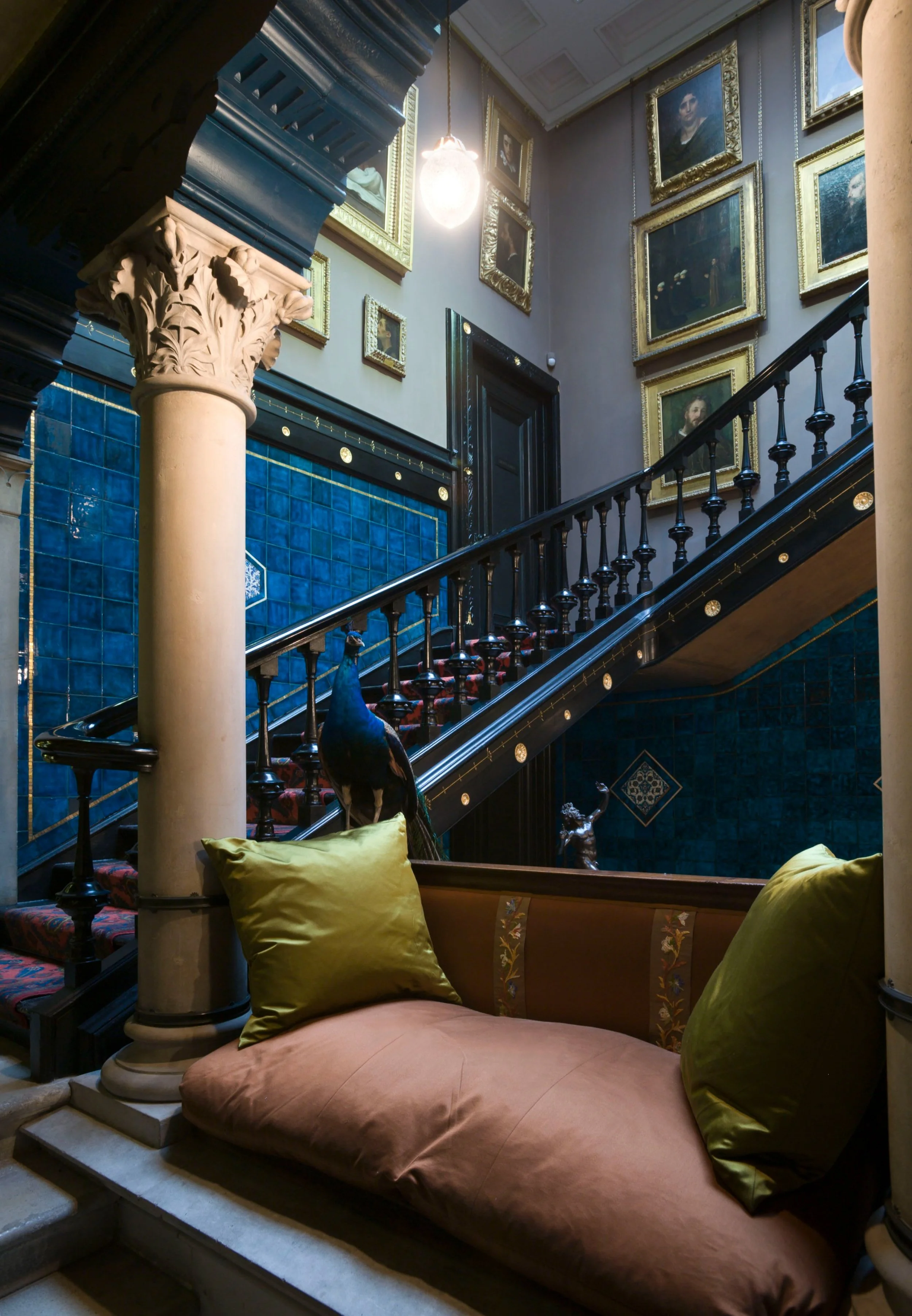 Sutton Vane Associates were commissioned to light Leighton House in exactly the way it had been lit in 1896. In 1895 Lord Leighton commissioned a series of photographs of the interiors. The new lighting also had to be able to show the house off and to provide bright modern levels for events which provide valuable income. No modern equipment is visible anywhere. The scheme can deliver historically accurate light levels or, at the touch of a hidden button, the house can become brighter and hidden spotlights show off the architectural marvels and even the decorative pool. The huge central fitting in the Arab Hall was restored and lights put back into the bird’s beaks where Lord Leighton had originally put them. One high dish in the fitting has concealed LED lights which make the dome glow.